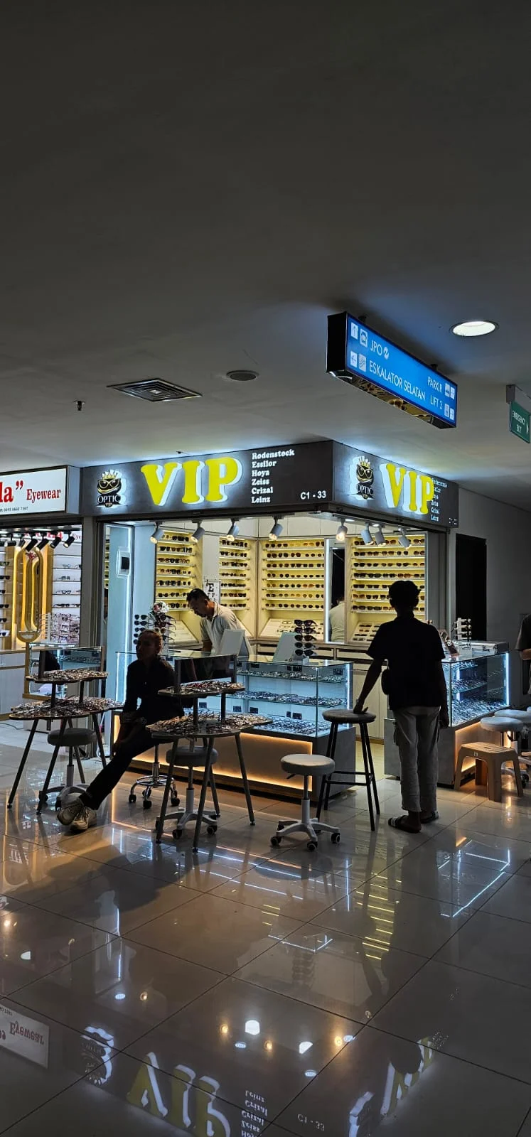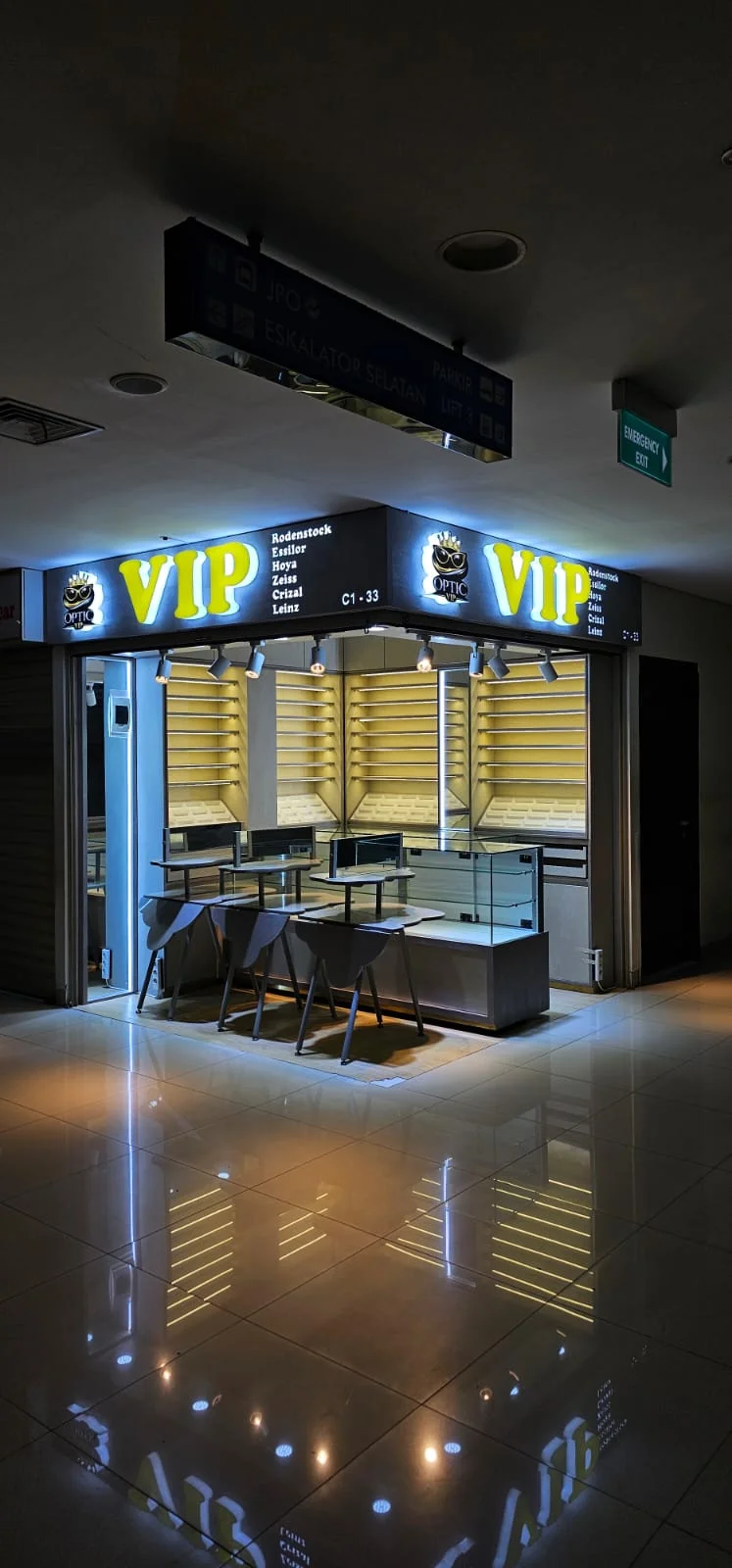Furnitur pada toko "Optic VIP" ini menampilkan desain modern yang mengedepankan transparansi dan pencahayaan fungsional. Area utama didominasi oleh **etalase kaca bening** dengan rangka minimalis yang dipadukan dengan dasar kabinet berbahan **papan kayu olahan (seperti MDF atau *plywood*)** dengan penyelesaian akhir (*finishing*) laminat berwarna abu-abu semen atau beton. Di area depan, terdapat meja pajangan unik berbentuk organik dengan kaki-kaki ramping yang terbuat dari **logam atau besi** berwarna perak, serta permukaan meja yang kemungkinan menggunakan material **akrilik atau kayu** tipis dengan pelapis laminat abu-abu. Setiap unit etalase dilengkapi dengan integrasi **lampu LED strip** di sepanjang bagian bawah dan sudut kaca untuk memberikan efek pendaran cahaya (*glow effect*) yang menonjolkan produk kacamata di dalamnya. Untuk area duduk, toko ini menggunakan kursi *stool* tanpa sandaran dengan rangka **logam** yang memiliki sistem putar dan alas kaki berbentuk bintang yang dilengkapi roda untuk fleksibilitas. Rak pajangan pada dinding bagian dalam menggunakan susunan ambalan horizontal yang kemungkinan besar terbuat dari material **akrilik susu atau kayu** dengan pencahayaan *backlit* yang memberikan suasana hangat dan mewah pada interior toko.