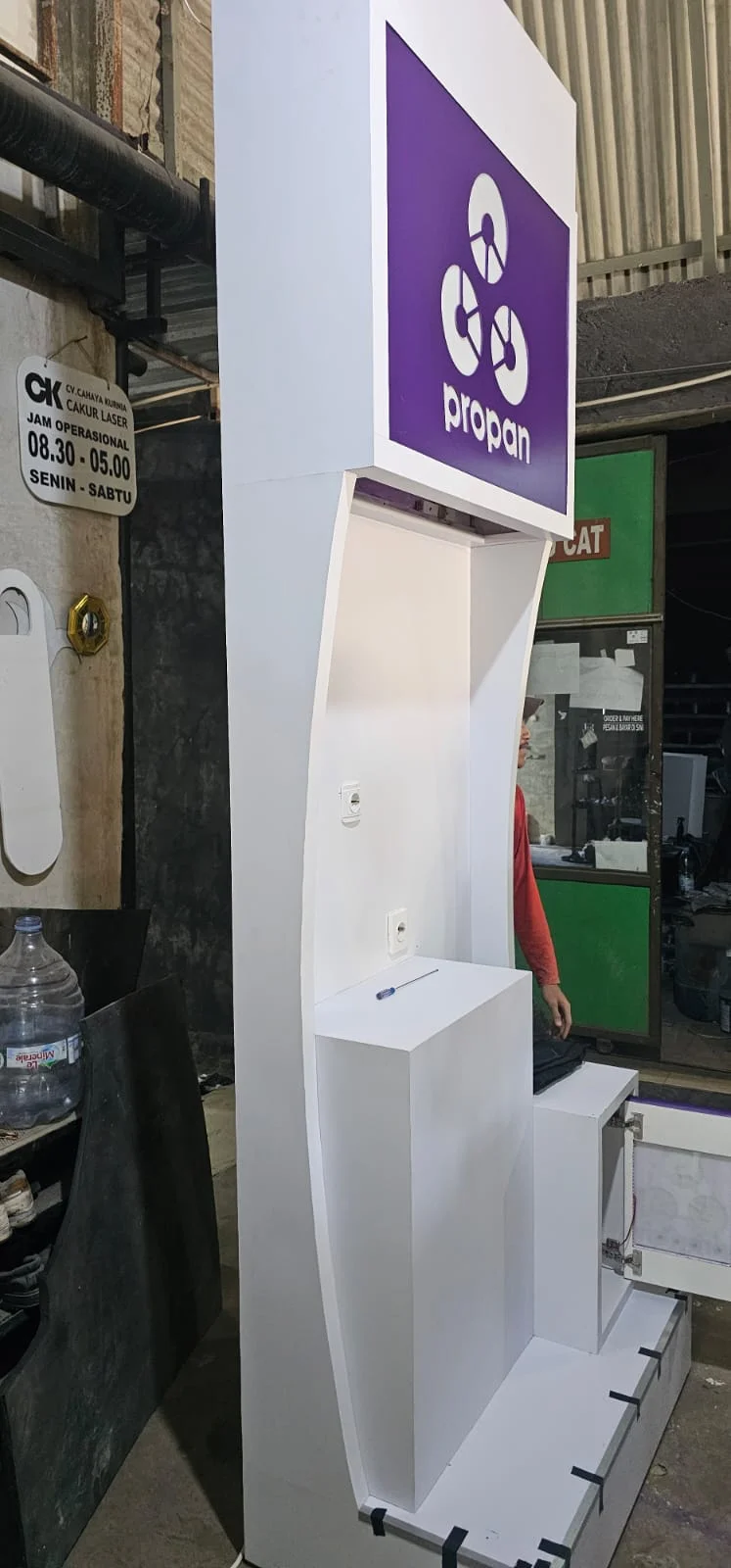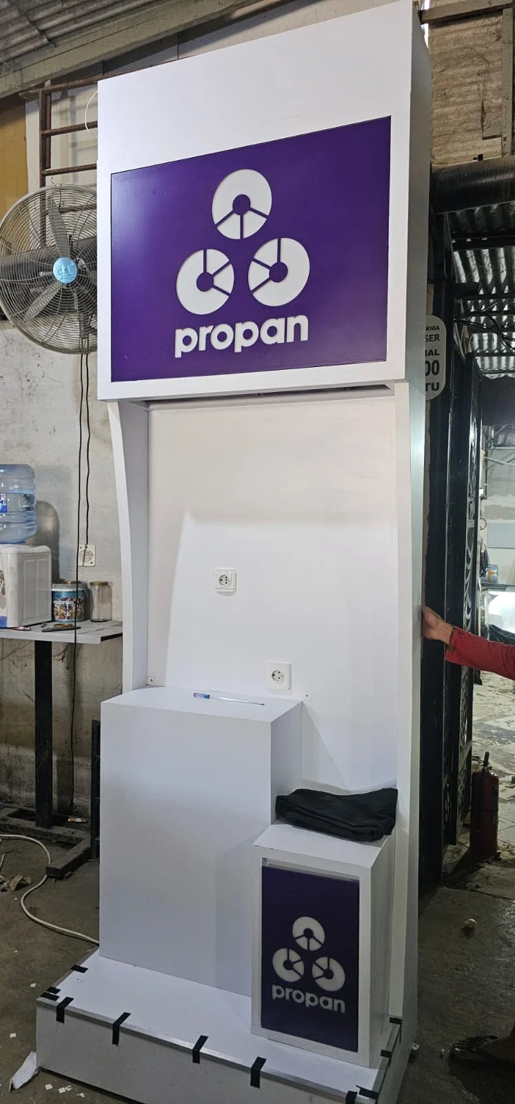 Furnitur pajangan (*display stand*) bermerek **"Propan"** ini memiliki struktur vertikal yang modern dan fungsional, dirancang untuk kebutuhan promosi produk di dalam ruangan. Rangka utama furnitur ini kemungkinan besar terbuat dari material **papan kayu olahan** seperti *plywood* atau MDF yang dilapisi dengan **HPL (*High Pressure Laminate*)** atau cat *duco* berwarna putih solid untuk memberikan tampilan yang bersih dan profesional. Bagian panel logo di sisi atas dan bawah menggunakan material **akrilik** berwarna ungu yang dikombinasikan dengan teknik *cutting* atau stiker untuk menampilkan identitas visual merek secara jelas. Desainnya mencakup beberapa tingkatan blok berbentuk kotak yang berfungsi sebagai meja pajangan produk, serta panel belakang yang dilengkapi dengan dua titik **stopkontak listrik** untuk mendukung demonstrasi alat atau pencahayaan tambahan. Di bagian atas, terdapat kompartemen lampu tersembunyi yang menggunakan LED untuk menerangi area pameran di bawahnya. Secara keseluruhan, penggunaan material laminat yang halus serta struktur yang kokoh menunjukkan bahwa furnitur ini dirancang agar tahan lama dan mudah dibersihkan saat digunakan di lingkungan toko atau pameran.
