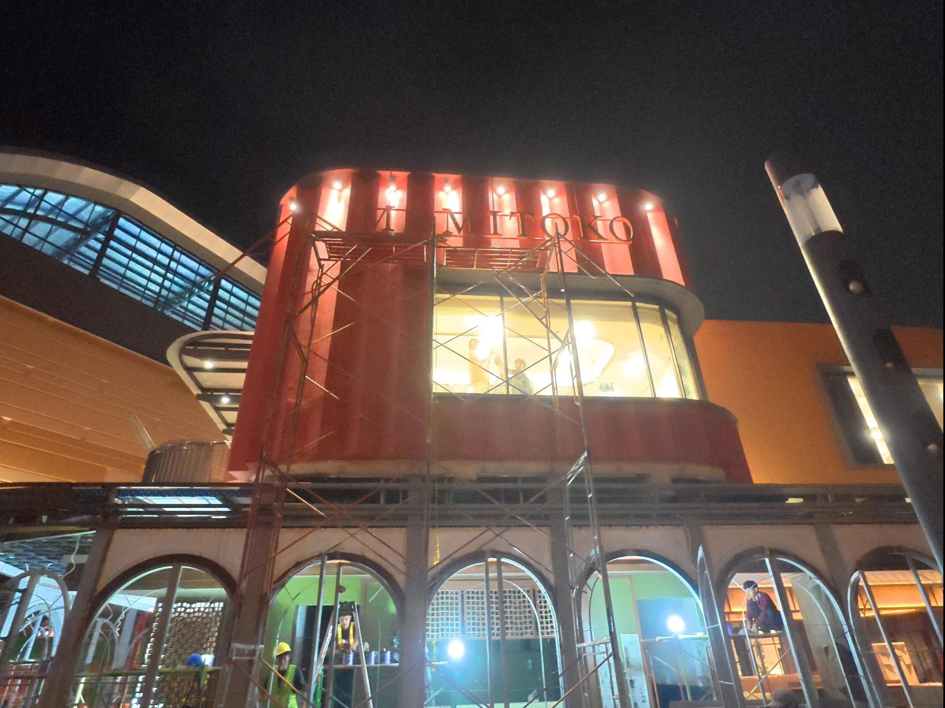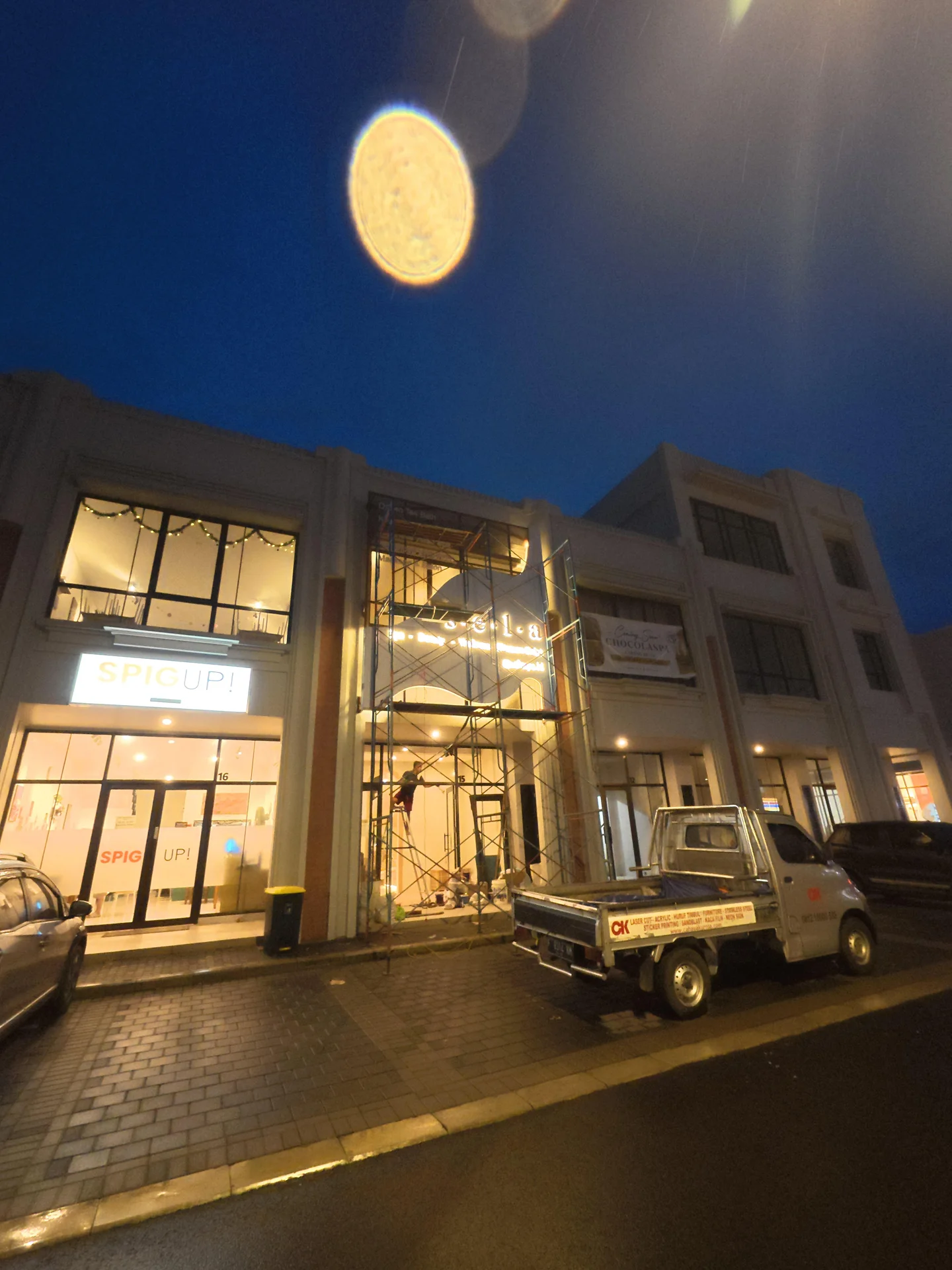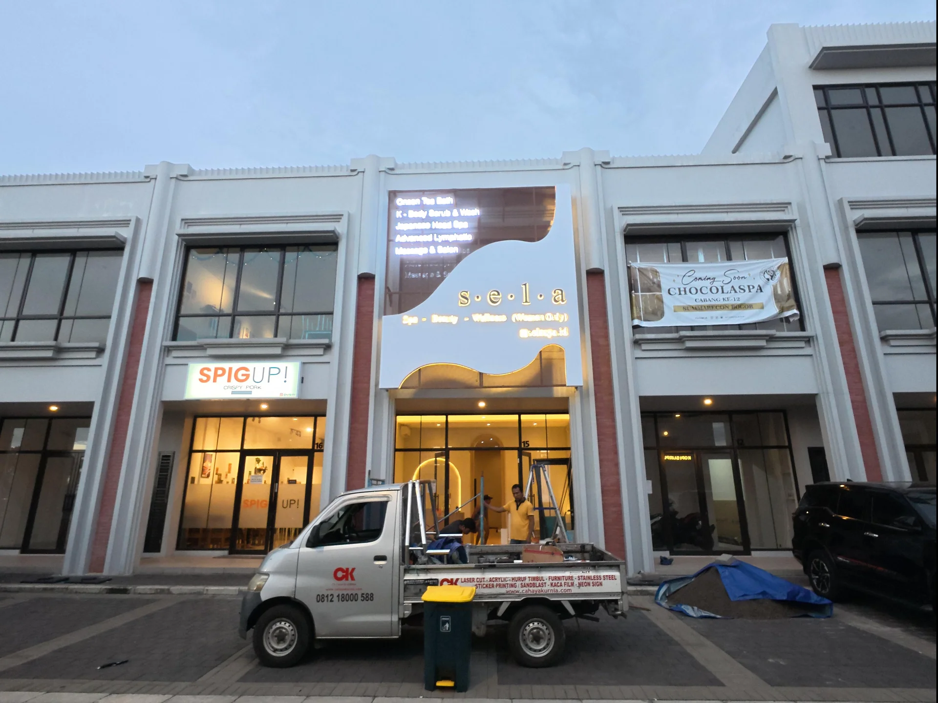 Papan merek Sela Spa pada fasad gedung ini menampilkan identitas visual yang bersih dan minimalis, sangat sesuai dengan citra bisnis kecantikan dan kesehatan. Papan merek utama menggunakan panel Aluminium Composite Panel (ACP) berwarna putih yang dipotong dengan bentuk gelombang (curvy) menggunakan mesin CNC router atau laser untuk memberikan kesan organik dan lembut. Elemen teks pada merek ini menggunakan material akrilik (acrylic) berwarna hitam solid yang dipotong presisi untuk menciptakan efek timbul (3D lettering), memberikan dimensi pada latar belakang putih yang dominan. Selain itu, pada bagian jendela atas, terdapat penggunaan cutting sticker atau stiker transparan yang menampilkan daftar layanan secara rapi, sementara pencahayaan eksternal dari lampu sorot di area bawah mempertegas keberadaan merek ini pada malam hari, menciptakan tampilan fasad yang modern, profesional, dan informatif bagi pelanggan wanita.