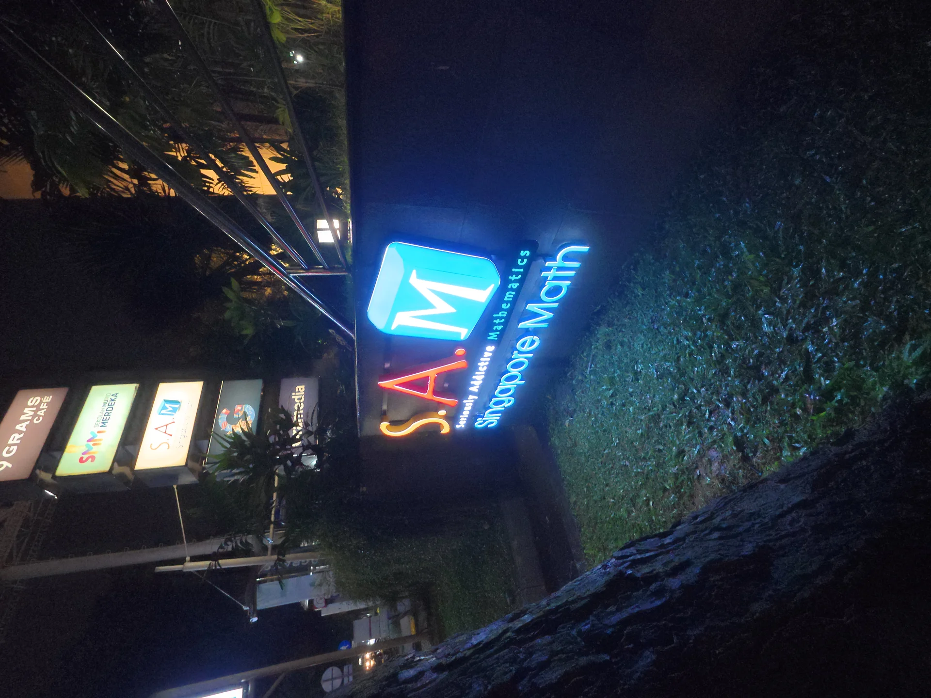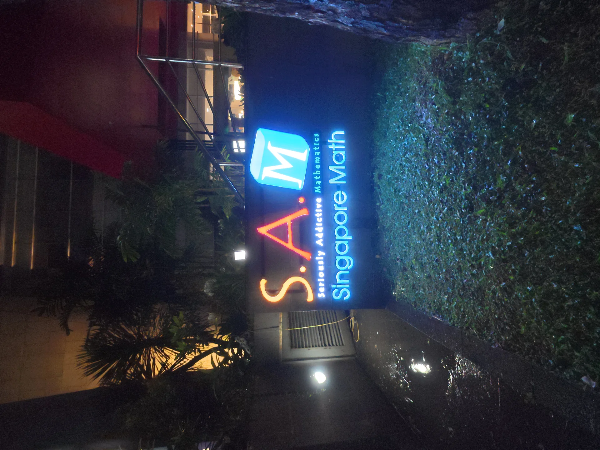 Signage luar ruang untuk S.A.M (Seriously Addictive Mathematics) ini menampilkan konsep illuminated branding yang sangat kontras dan modern, menggunakan kombinasi material acrylic dan sistem pencahayaan LED internal. Huruf utama "S.A." menggunakan teknik letter timbul acrylic berwarna oranye dan merah dengan pendaran cahaya yang merata ke seluruh permukaan (full-lit). Sementara itu, elemen huruf "M" ditempatkan di dalam kotak berbentuk kubus tiga dimensi berbahan acrylic biru transparan yang memberikan efek kedalaman (depth) visual yang unik. Pada bagian teks pendukung, yaitu "Seriously Addictive Mathematics" dan "Singapore Math", digunakan material acrylic cutting dengan sistem pencahayaan front-lit berwarna putih jernih dan biru muda. Seluruh komponen signage ini dipasang secara bold pada dinding semen ekspos abu-abu, menciptakan tampilan yang sangat menonjol di malam hari. Penggunaan material acrylic berkualitas tinggi dan lampu LED ini memastikan warna tetap tajam dan cerah, memberikan kesan profesional serta ramah anak yang sesuai dengan identitas lembaga pendidikan tersebut.