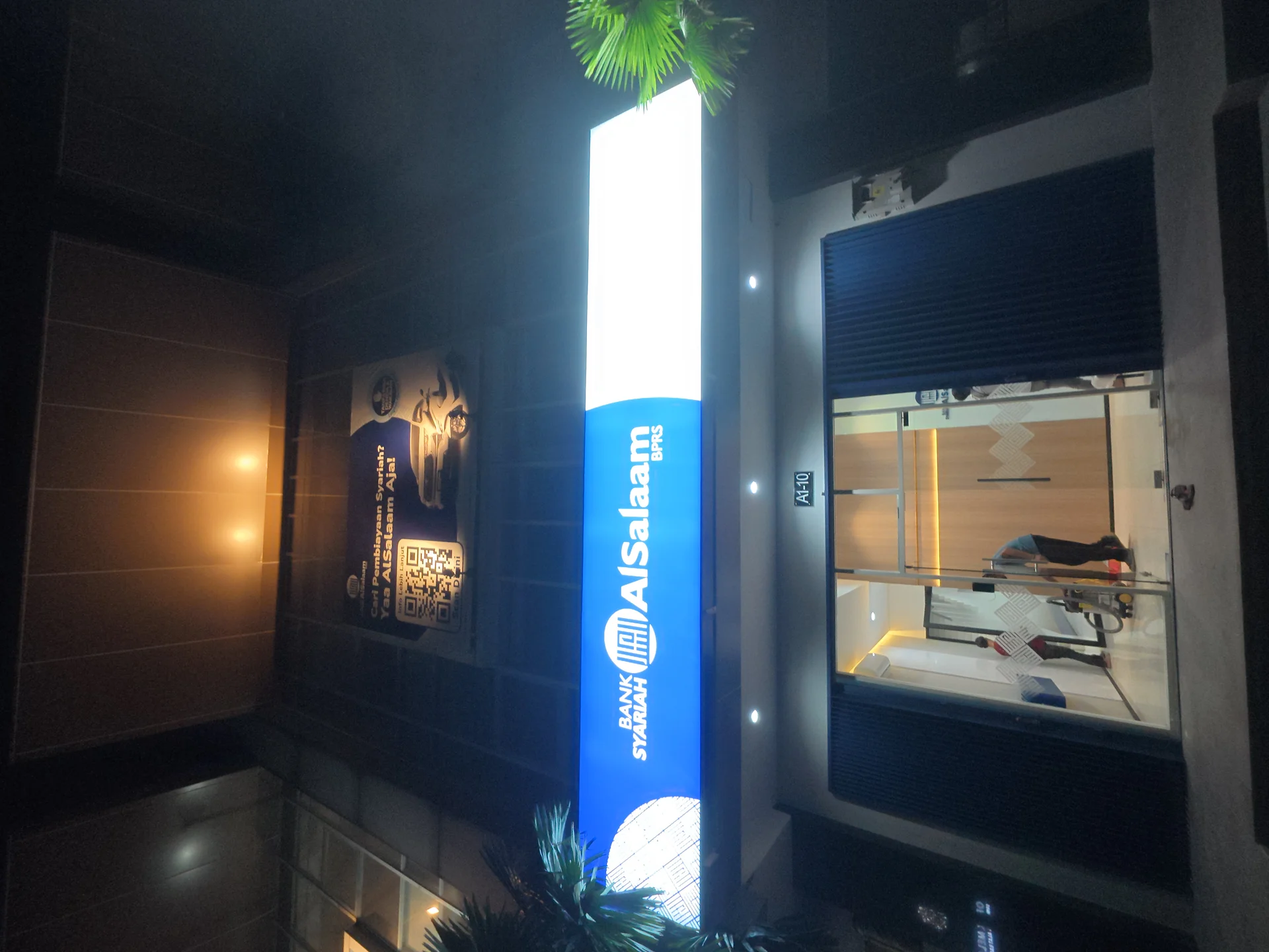 Signage fasad pada kantor Bank Syariah Al Salaam ini menggunakan sistem neon box memanjang yang memberikan pencahayaan sangat terang dan merata pada seluruh permukaannya. Material utama yang digunakan adalah backlit film atau flexy backlit kualitas tinggi yang dilapisi dengan teknik cutting sticker atau cetakan digital untuk menampilkan identitas warna biru khas bank dan logo putih yang presisi. Kerangka neon box ini menggunakan profil aluminium atau galvanil yang kokoh pada bagian pinggirnya, dengan sistem pencahayaan internal menggunakan LED modul yang efisien namun mampu menghasilkan pendaran cahaya putih yang tajam dari balik permukaan acrylic atau panel fleksibelnya.