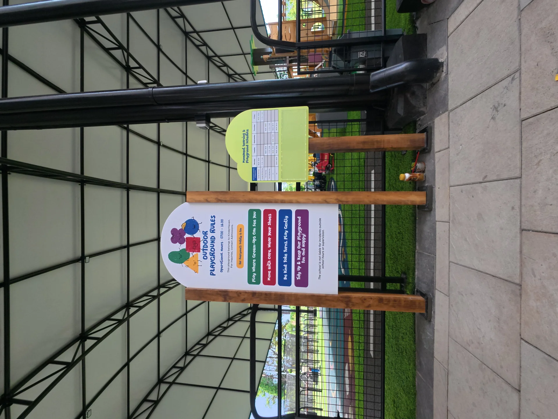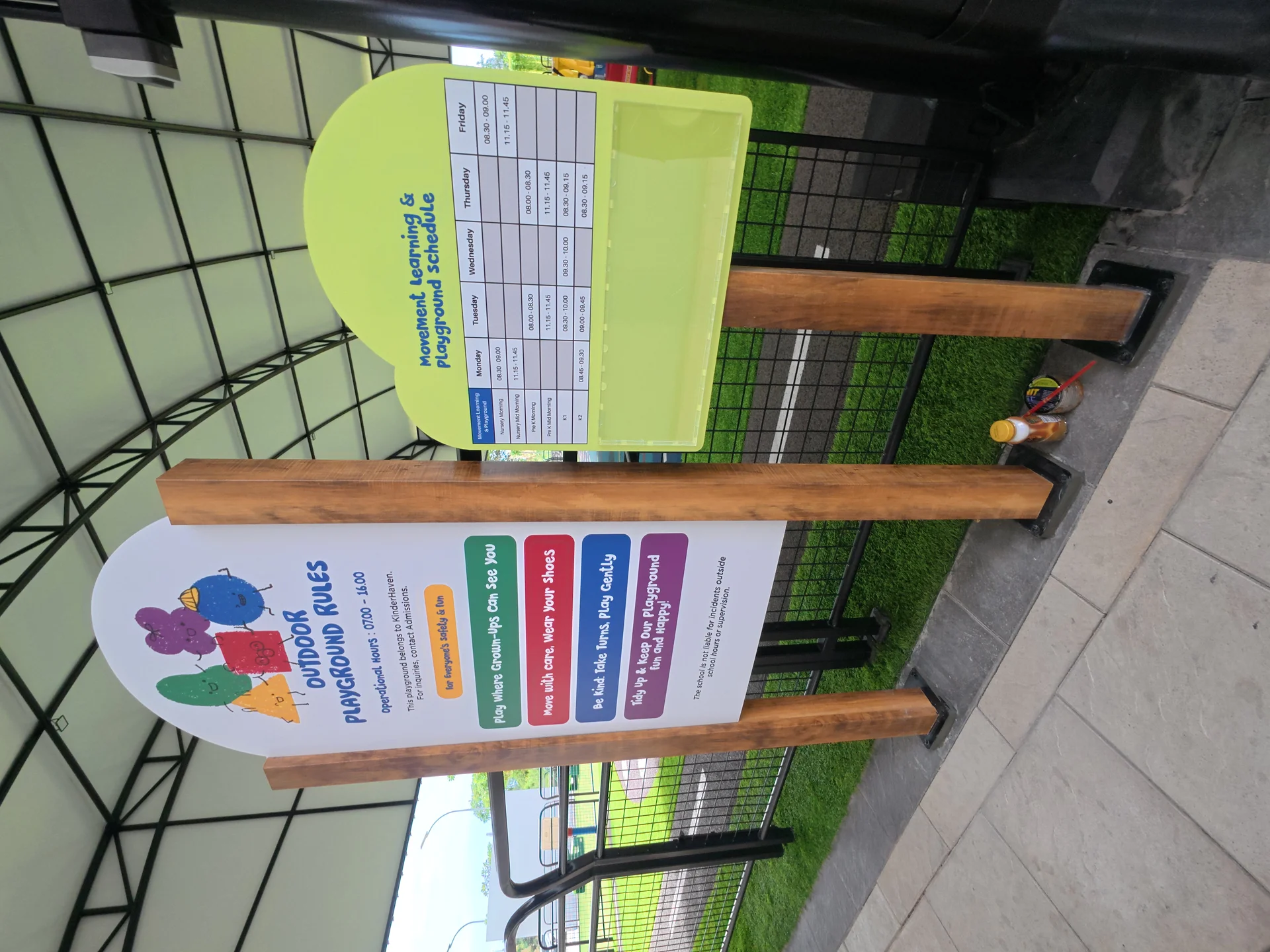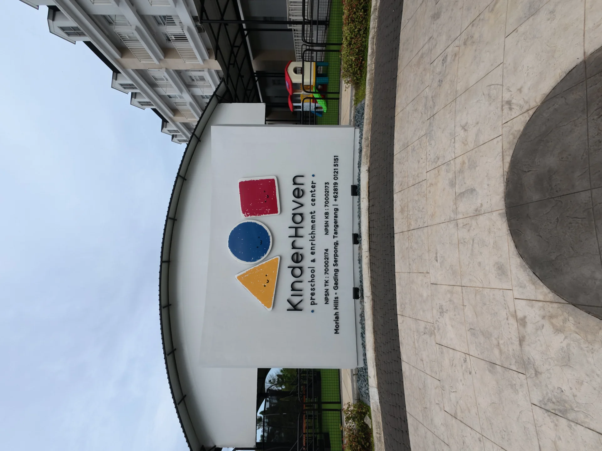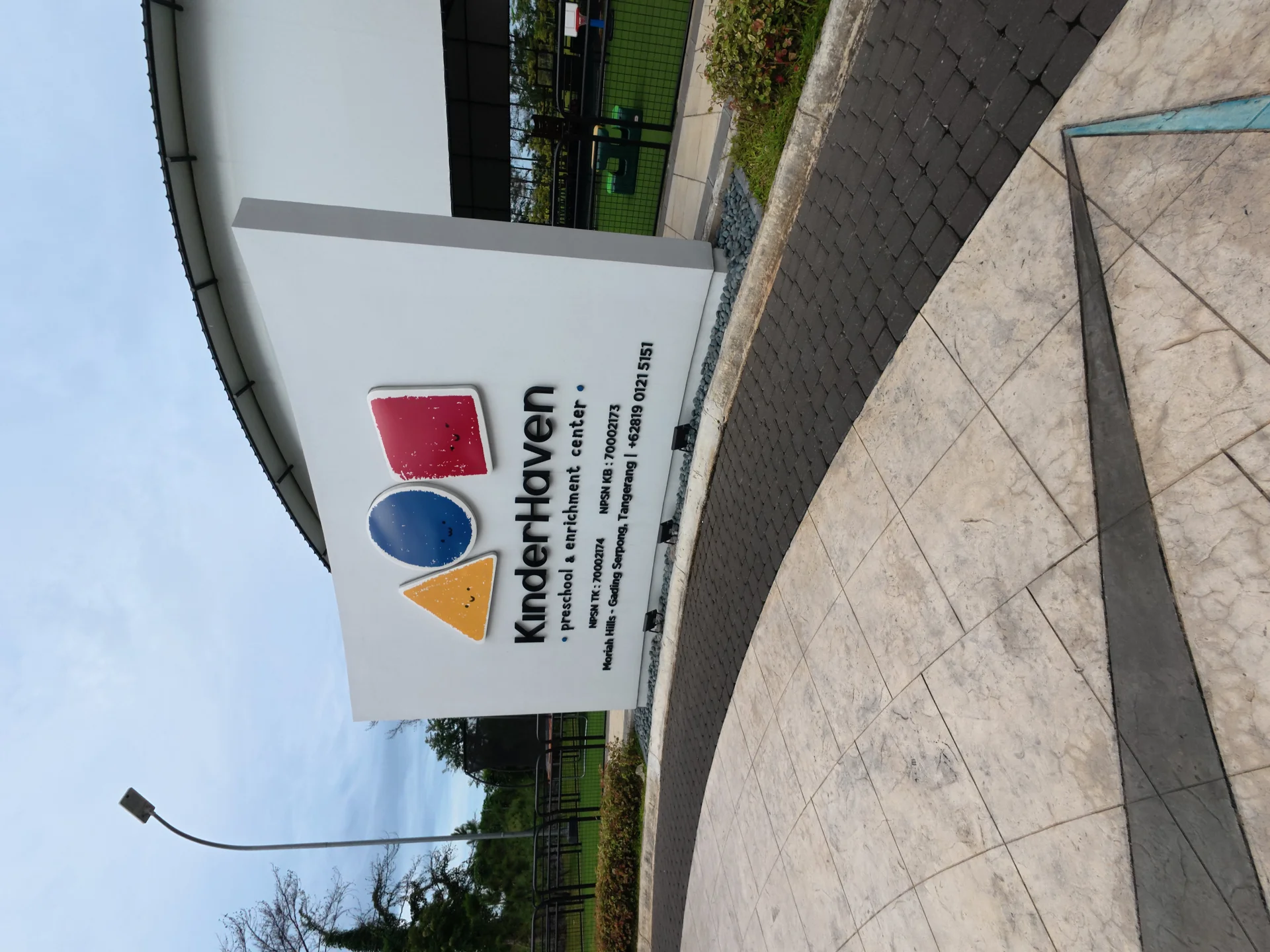 Visual identitas KinderHaven menampilkan kombinasi material yang memberikan kesan ceria sekaligus profesional untuk lingkungan pendidikan anak. Papan nama utama menggunakan teknik huruf timbul (3D letter) berbahan acrylic dengan finishing matte, di mana logo tiga bentuk geometri (segitiga, lingkaran, dan persegi) dicetak menggunakan metode digital printing atau UV printing untuk menghasilkan detail tekstur wajah yang ekspresif. Seluruh elemen grafis ini dipasang secara bold pada dinding fasad putih minimalis, menciptakan kontras yang bersih dan mudah terbaca dari kejauhan. Untuk elemen informasi di area bermain, signage menggunakan panel high-pressure laminate (HPL) atau acrylic lembaran tebal dengan sudut-sudut yang melingkar (rounded) demi keamanan anak-anak. Informasi jadwal dan peraturan dicetak pada stiker vinyl berkualitas tinggi yang dilaminasi agar tahan terhadap cuaca (weatherproof). Struktur pendukung papan informasi ini menggunakan tiang kayu atau metal dengan pelapis hpl motif kayu bertekstur hangat, yang memberikan kesan alami dan ramah lingkungan. Perpaduan material modern yang tahan lama dengan aksen warna-warni ini secara keseluruhan mencerminkan identitas sekolah yang aman, terorganisir, dan menyenangkan.