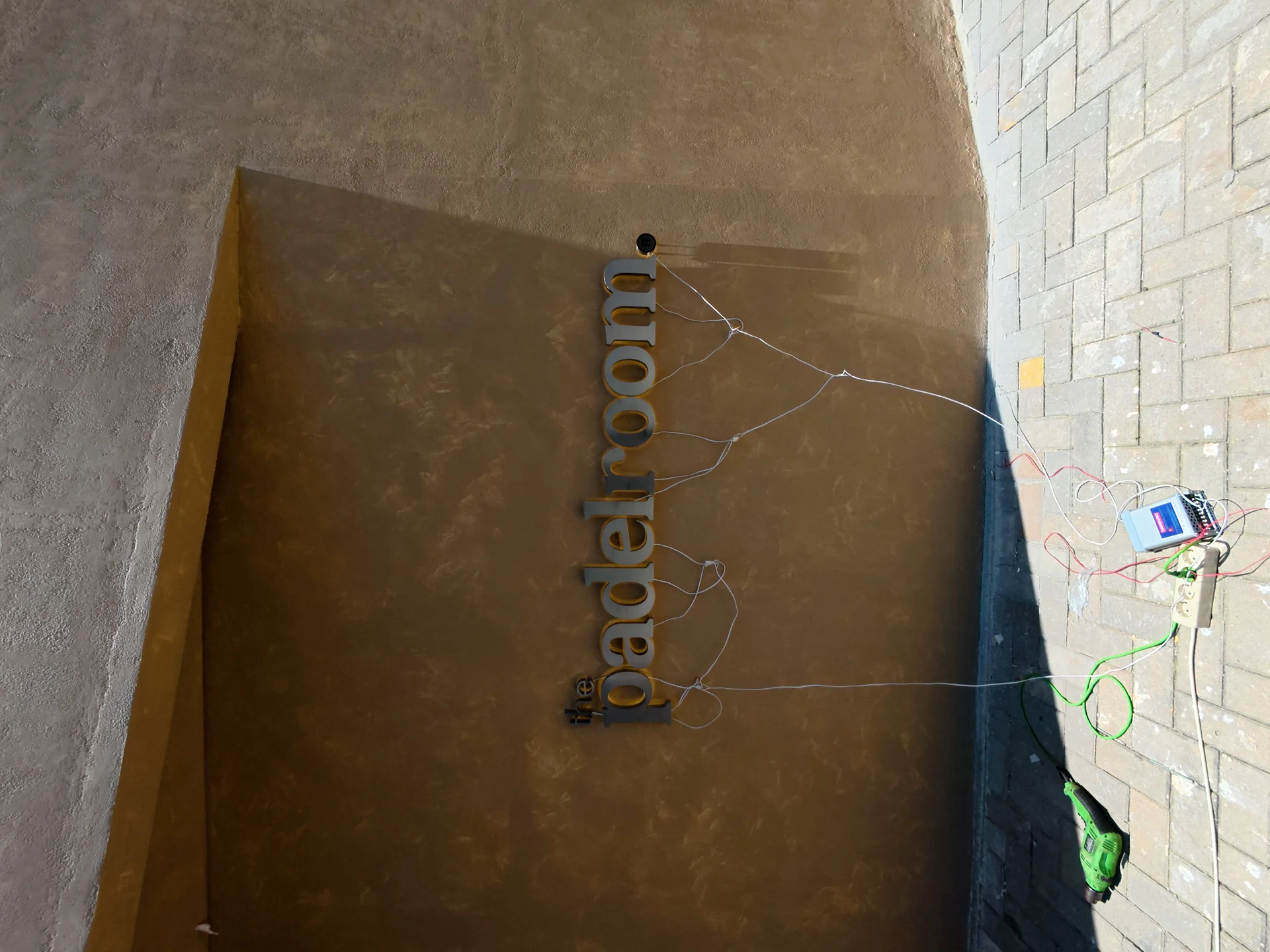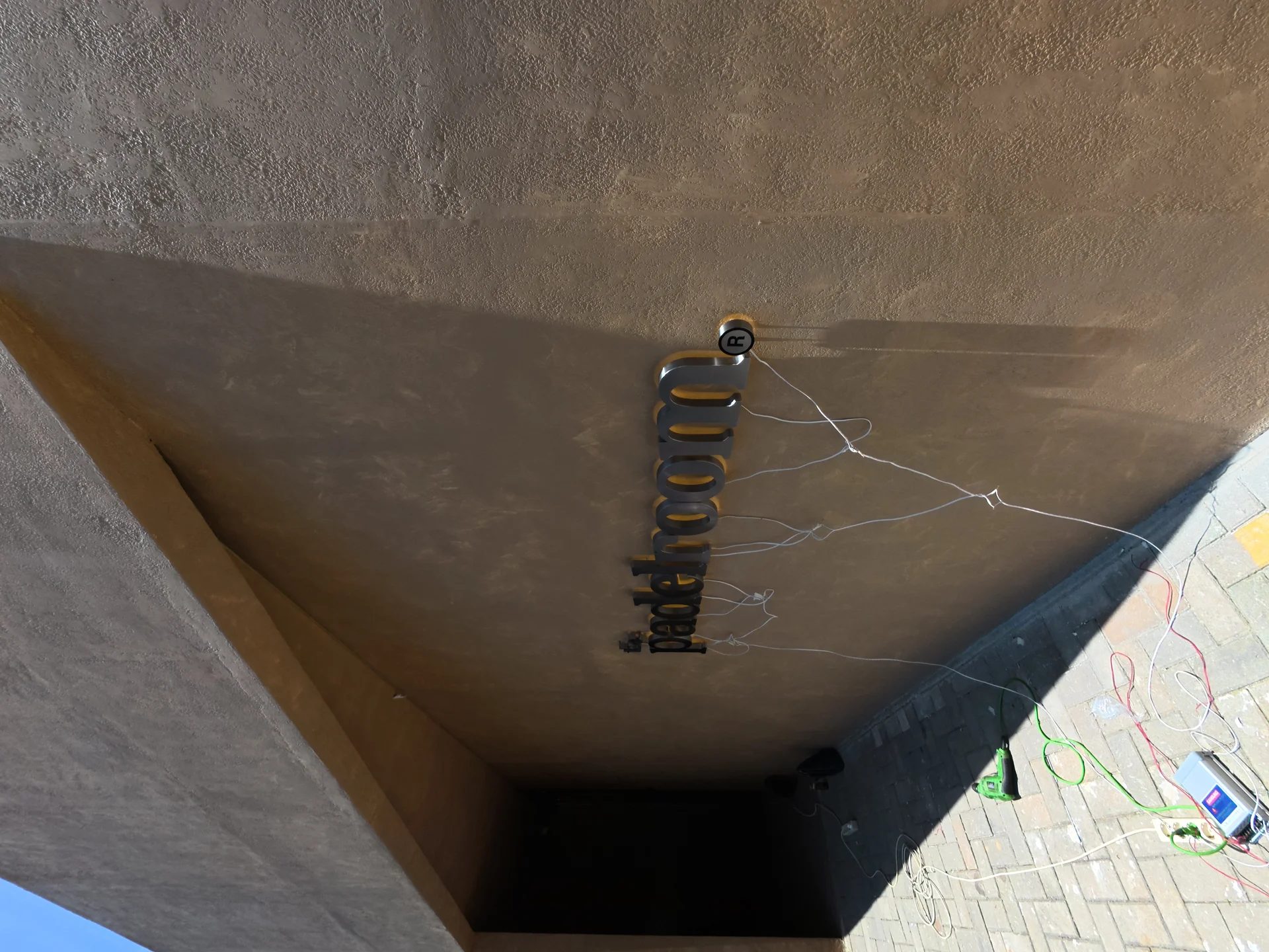 Signage luar ruang untuk The Padel Room ini menampilkan kesan industrial yang maskulin dan modern, menggunakan teknik huruf timbul (3D letter) dengan sistem pencahayaan backlit atau halo light. Material utama huruf menggunakan logam, kemungkinan besar adalah stainless steel atau galvanil dengan finishing cat powder coating berwarna abu-abu gelap (charcoal) atau hitam matte. Penggunaan efek backlit memberikan pendaran cahaya kuning hangat (warm white) dari balik huruf ke permukaan dinding, menciptakan siluet yang tegas dan elegan pada malam hari.