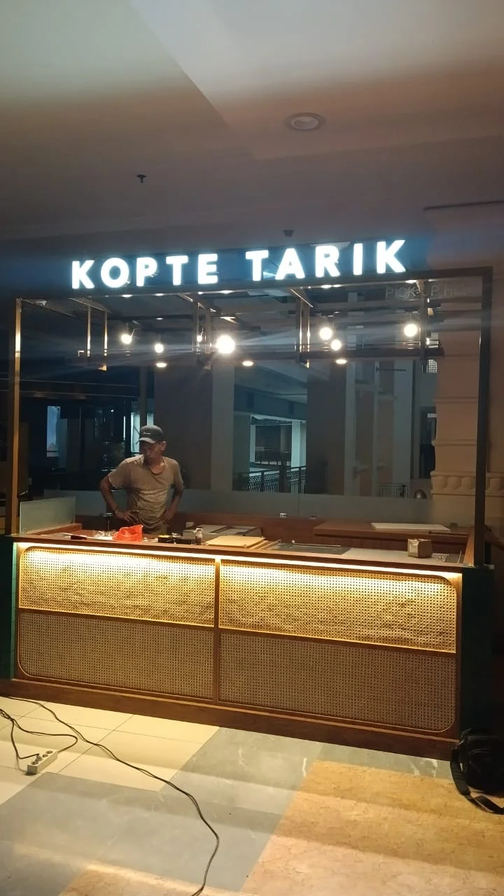 Papan merek Kopte Tarik pada gambar tersebut menampilkan kesan modern dan minimalis melalui penggunaan sistem 3D LED channel letter yang sangat terang dan bersih. Karakter huruf dibuat menggunakan material akrilik (acrylic) susu berkualitas tinggi pada bagian permukaan depan untuk menghasilkan pendaran cahaya putih yang merata, sementara bagian samping huruf menggunakan plat logam seperti stainless steel atau aluminium yang dicat hitam agar memberikan struktur yang kokoh dan tegas. Pencahayaan internal didukung oleh modul LED putih yang dipasang pada rangka besi minimalis di atas area gerai, menciptakan kontras yang sangat kuat terhadap latar belakang ruangan yang remang. Desain merek ini dipadukan secara harmonis dengan estetika gerai yang menggunakan panel rotan alami dan pencahayaan warm white pada bagian meja, mencerminkan citra merek minuman kontemporer yang profesional dan menarik perhatian pengunjung di area pusat perbelanjaan.