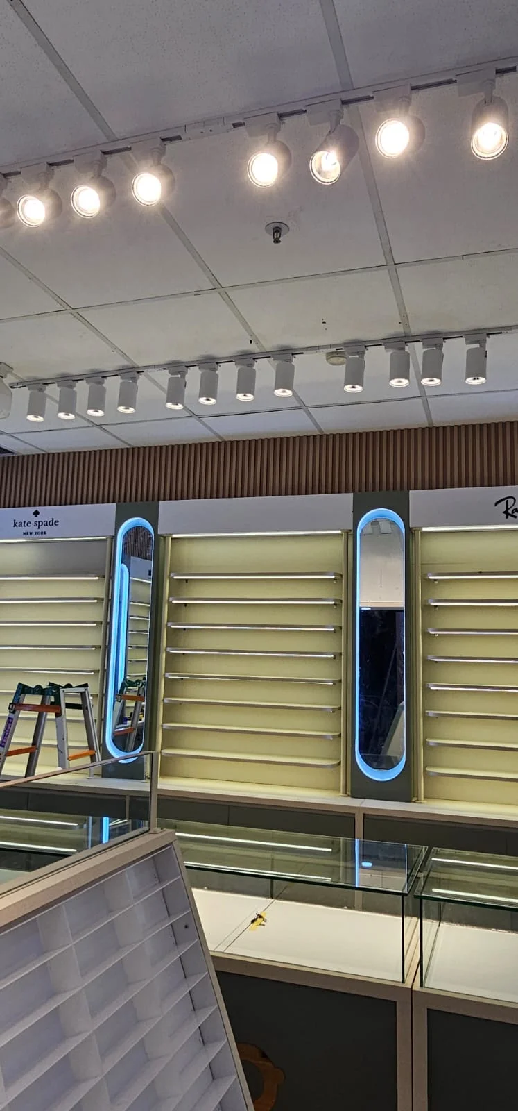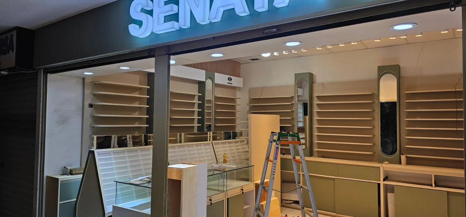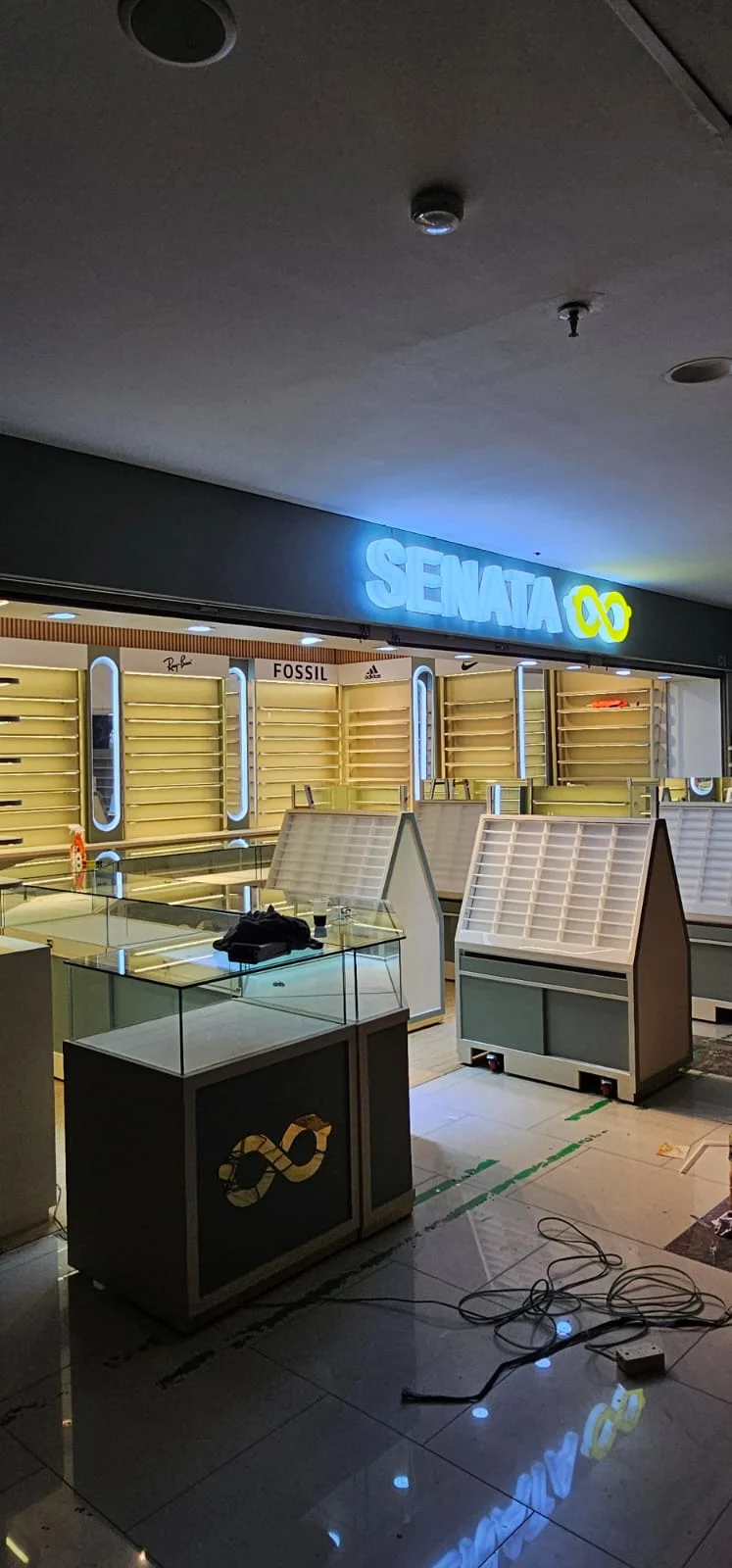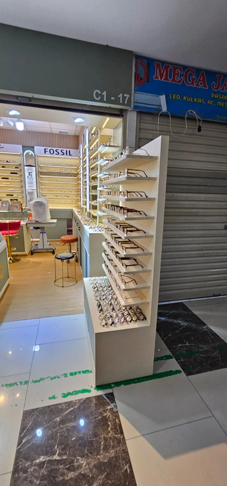 Interior toko optik "SENATA" ini mengusung konsep modern minimalis dengan penggunaan material yang fungsional dan estetis. Area utama didominasi oleh furnitur custom yang terbuat dari papan kayu olahan seperti MDF atau plywood dengan penyelesaian akhir (finishing) laminat berwarna krem dan hijau pastel yang memberikan kesan bersih. Bagian pajangan produk menggunakan kombinasi rak terbuka dan etalase kaca bening tebal dengan bingkai minimalis untuk memberikan visibilitas maksimal pada koleksi kacamata. Pada bagian dinding, terdapat aksen panel dekoratif berupa kisi-kisi kayu (wood slats) yang menambah tekstur pada ruangan, serta integrasi cermin berbentuk oval dengan bingkai lampu LED backlit berwarna biru muda untuk area mencoba produk. Pencahayaan interior didukung oleh deretan lampu track light LED berwarna putih hangat di langit-langit serta lampu downlight tanam untuk memastikan setiap sudut produk terpapar cahaya dengan merata. Sementara itu, bagian lantai menggunakan ubin granit atau porselen berukuran besar dengan motif marmer yang memberikan kesan mewah dan mudah dibersihkan.