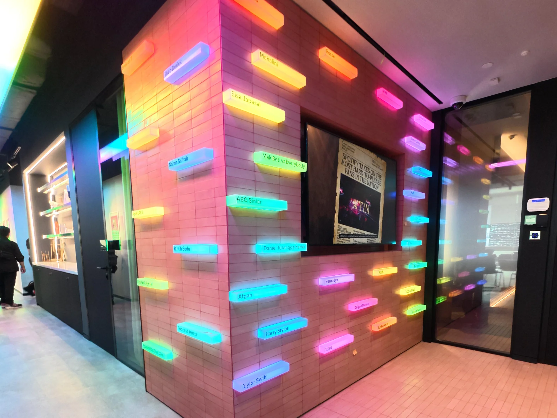 Instalasi dinding ini menampilkan daftar berbagai artis dan kreator konten yang disusun menggunakan material modern dengan efek pencahayaan yang menarik. Setiap nama merek atau artis tersebut dicetak di atas panel **akrilik susu (frosted acrylic)** berbentuk kotak memanjang yang berfungsi sebagai *diffuser* cahaya. Di dalam panel akrilik ini terdapat lampu **LED** yang memancarkan warna-warna cerah seperti merah, hijau, dan putih, memberikan kesan futuristik dan dinamis pada setiap nama yang terpampang. Panel-panel bercahaya tersebut dipasang secara menonjol pada dinding yang terbuat dari material **bata ekspos (terracotta bricks)** berwarna merah bata alami yang disusun secara horizontal. Tekstur kasar dan organik dari bata tersebut memberikan kontras visual yang kuat terhadap permukaan halus dan mengkilap dari panel akrilik. Secara keseluruhan, kombinasi bahan bata tradisional dengan teknologi pencahayaan LED ini menciptakan sebuah elemen interior yang modern, informatif, sekaligus menjadi titik fokus (*centerpiece*) yang estetis di dalam ruangan tersebut.