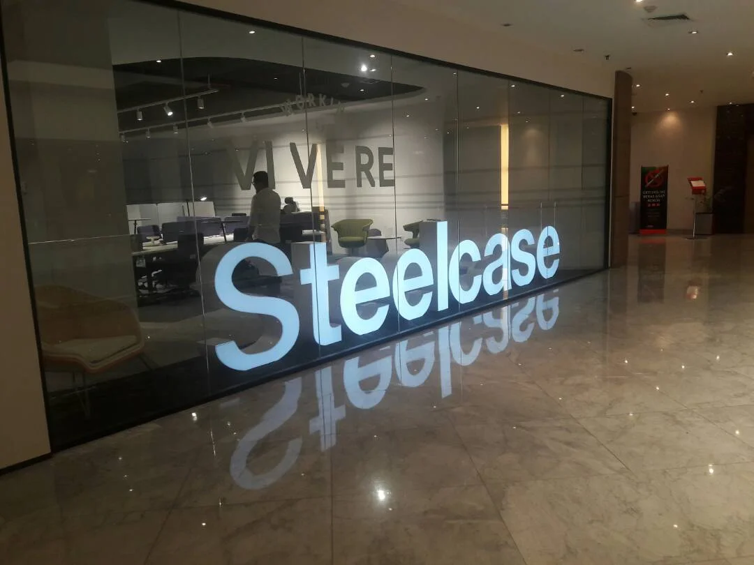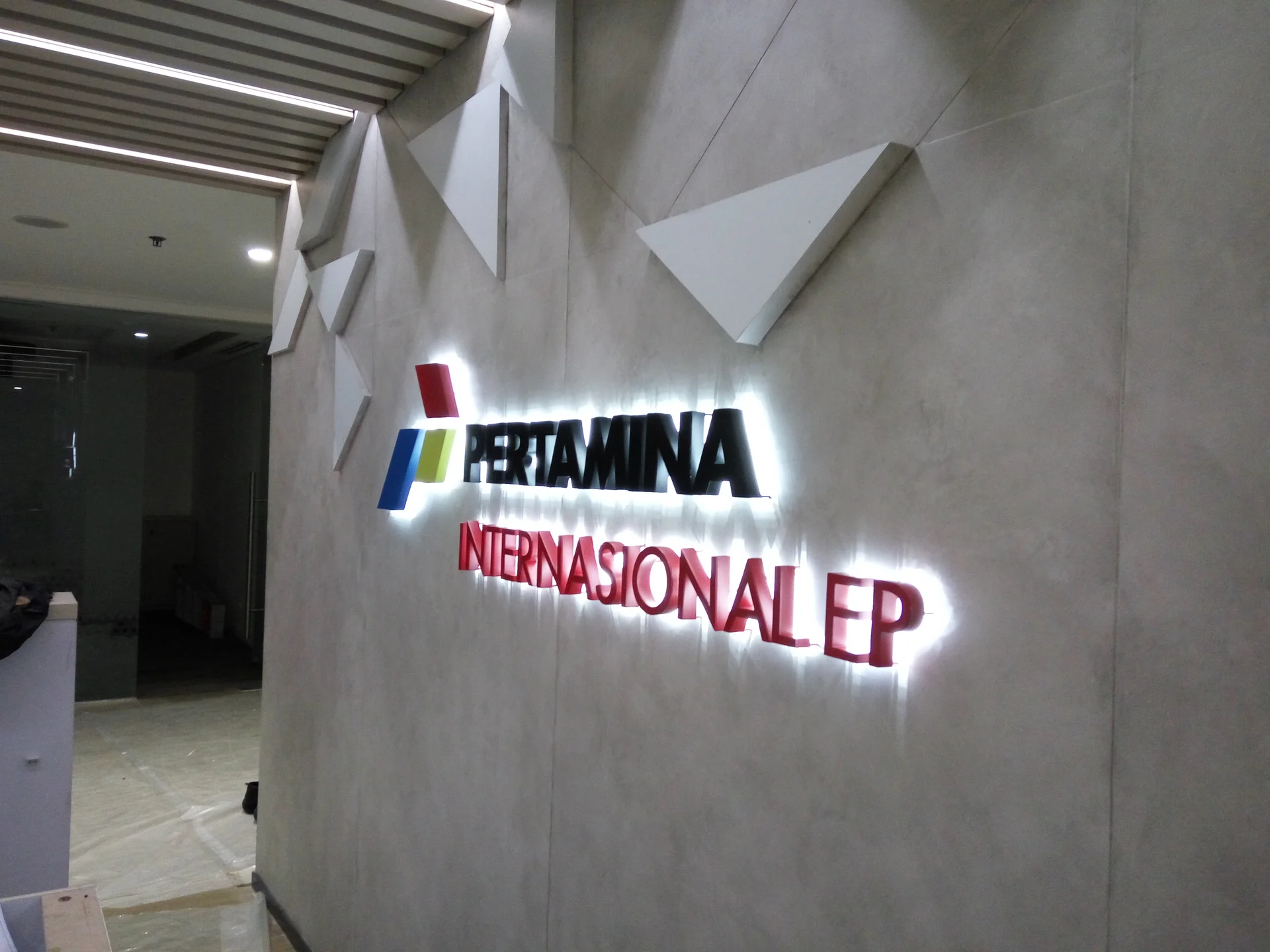 signage Pertamina Internasional EP pada gambar tersebut menggunakan material huruf timbul (3D letter) yang dipasang dengan teknik backlit atau halo-lit, memberikan efek cahaya yang berpendar dari balik huruf ke arah dinding. Huruf-huruf tersebut kemungkinan besar terbuat dari material logam atau akrilik solid dengan finishing cat sesuai warna identitas korporat (biru, hijau, merah untuk logo, serta hitam dan merah untuk teks). Efek pencahayaan ini dihasilkan oleh lampu LED yang tersembunyi di dalam atau di belakang badan huruf, menciptakan kesan premium, elegan, dan profesional yang sangat cocok untuk area lobi kantor.