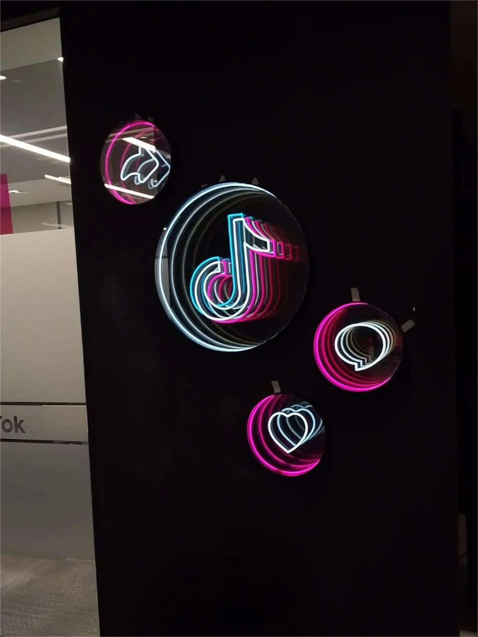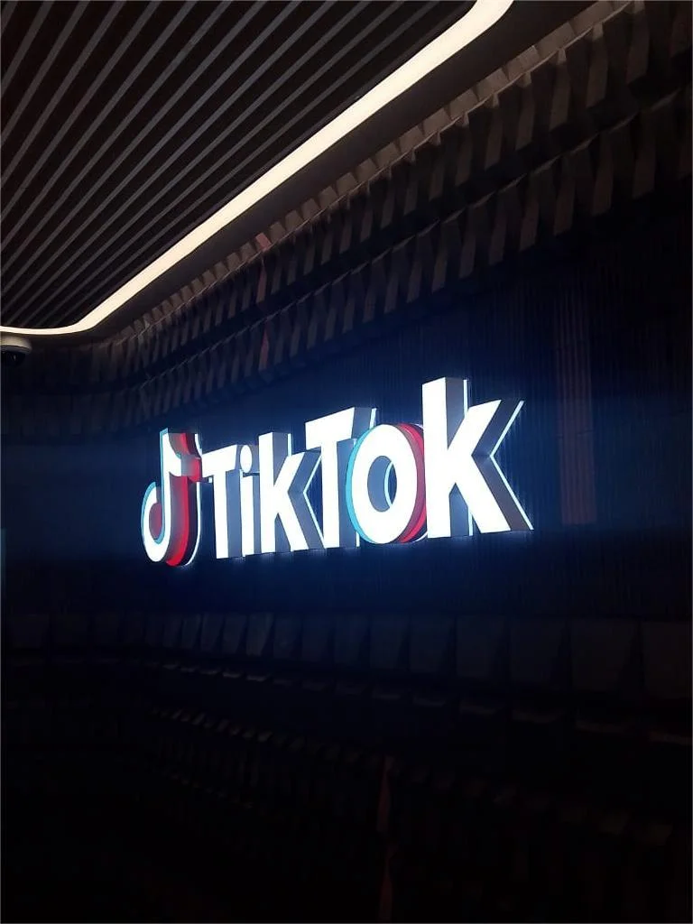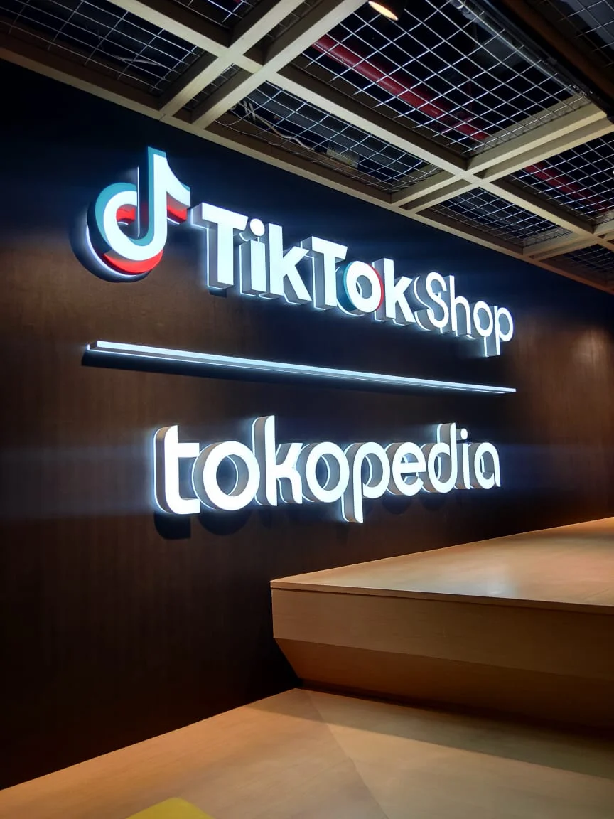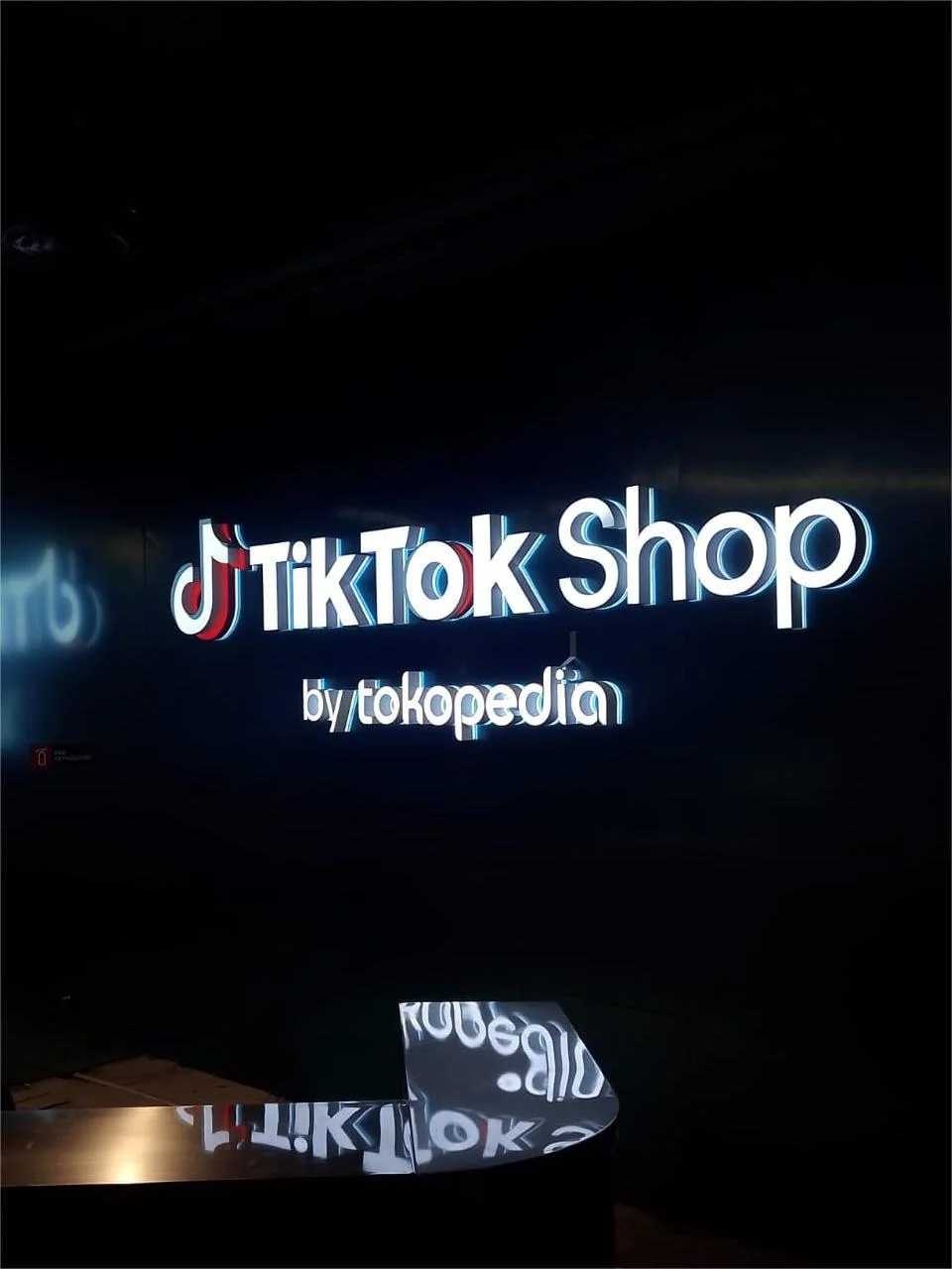 Papan merek kolaborasi TikTok Shop dan Tokopedia pada gambar tersebut menampilkan estetika modern dan futuristik melalui penggunaan sistem 3D LED channel letter yang sangat kontras. Karakter huruf dan logo ikonik TikTok dibuat menggunakan material akrilik (acrylic) susu berkualitas tinggi pada bagian permukaannya untuk menghasilkan pendaran cahaya putih yang merata dan tajam, sementara bagian samping huruf menggunakan material logam seperti stainless steel atau galvanis yang dicat hitam agar menyatu dengan latar belakang. Sistem pencahayaan internal menggunakan modul LED putih yang memberikan efek cahaya terang dan bersih, dipasang pada dinding bertekstur matte berwarna gelap yang kemungkinan besar dilapisi dengan panel kayu HPL atau PVC board. Perpaduan antara tipografi putih yang bercahaya dengan latar belakang gelap ini menciptakan identitas visual yang elegan dan profesional, mempertegas sinergi antara kedua platform besar tersebut dalam satu ruang interior yang eksklusif.