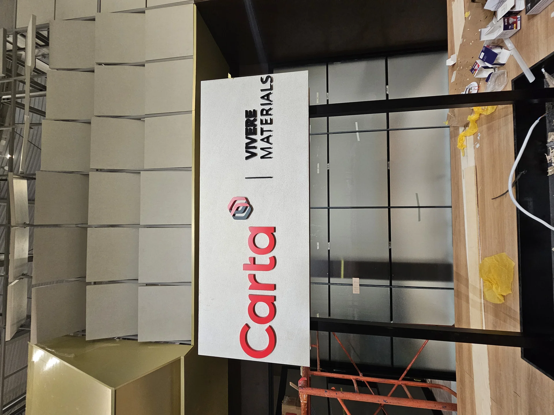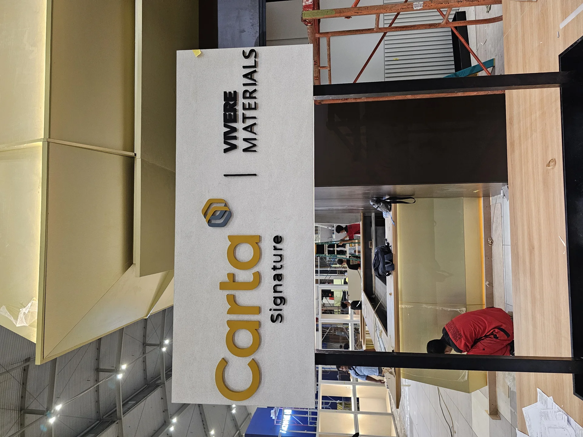 Merek Carta Signature | Vivere Materials pada gambar tersebut menampilkan estetika modern yang sangat menonjolkan tekstur material. Elemen utama berupa logo dan tipografi menggunakan material huruf timbul (3D cutting letter) yang terbuat dari akrilik solid dengan finishing cat doff (matte) berwarna kuning mustard, merah, dan hitam sesuai identitas masing-masing sub-merek. Penggunaan huruf timbul ini memberikan dimensi visual yang tegas dan bayangan alami yang memperkuat kesan premium pada panel informasi tersebut.