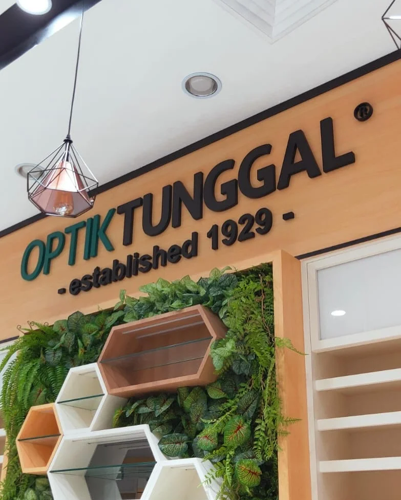 Papan nama merek Optik Tunggal pada gerai ini menggunakan kombinasi material yang menonjolkan kesan warisan (heritage) sekaligus modernitas. Huruf timbul utamanya dibuat dari bahan akrilik putih dengan sistem pencahayaan LED internal yang menghasilkan pendaran cahaya putih bersih dan merata di seluruh permukaan huruf. Nama merek tersebut dipasang di atas panel latar belakang berbahan Akrilik dengan finishing backpaint hijau , yang memberikan kontras tajam sehingga identitas merek tetap terbaca dengan jelas di bawah cahaya lampu mall yang terang.