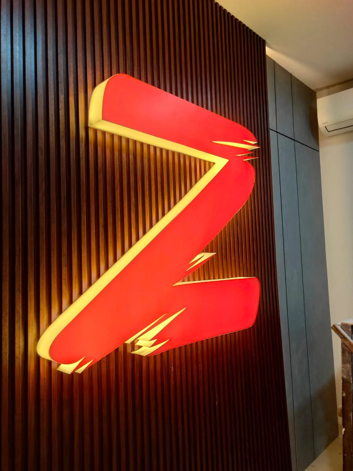 Logo berbentuk huruf **"Z"** yang dinamis ini merupakan papan nama dekoratif (signage) dengan sistem pencahayaan internal atau *backlit*. Dilihat dari tampilannya, bagian depan (*face*) logo kemungkinan besar terbuat dari material **akrilik (acrylic)** berwarna merah atau oranye solid yang mampu menyebarkan cahaya secara merata (diffuser). Pada bagian pinggir atau kerangka sampingnya (*side return*), material yang digunakan tampak seperti akrilik susu atau **PVC** berwarna putih/kekuningan yang berfungsi sebagai struktur penopang sekaligus memberikan efek *glow* di sekeliling logo. Logo ini dipasang secara *floating* (mengambang) pada latar belakang dinding berupa panel kayu berpola garis vertikal (**WPC wall panel** atau kisi-kisi kayu) dengan warna cokelat tua yang memberikan kesan mewah dan profesional. Untuk pencahayaannya, di dalam rongga huruf tersebut tertanam lampu **LED Strip** atau **LED Module** yang memberikan efek pendaran cahaya (*halo effect*) pada sela-sela desain huruf, menonjolkan detail aksen tajam menyerupai goresan kuas pada sisi kanan logo. Kombinasi material sintetis yang modern dengan latar kayu alami ini menciptakan kontras visual yang elegan serta sangat menarik perhatian di dalam ruangan.